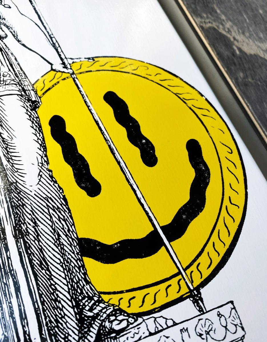 Au verso, le bois sombre est marqué d’un discret smiley gravé, comme une signature minimaliste cachée dans la matière. Il est trop tard pour se la procurer, la planche est malheureusement déjà sold out sur le site de streetart.fr.