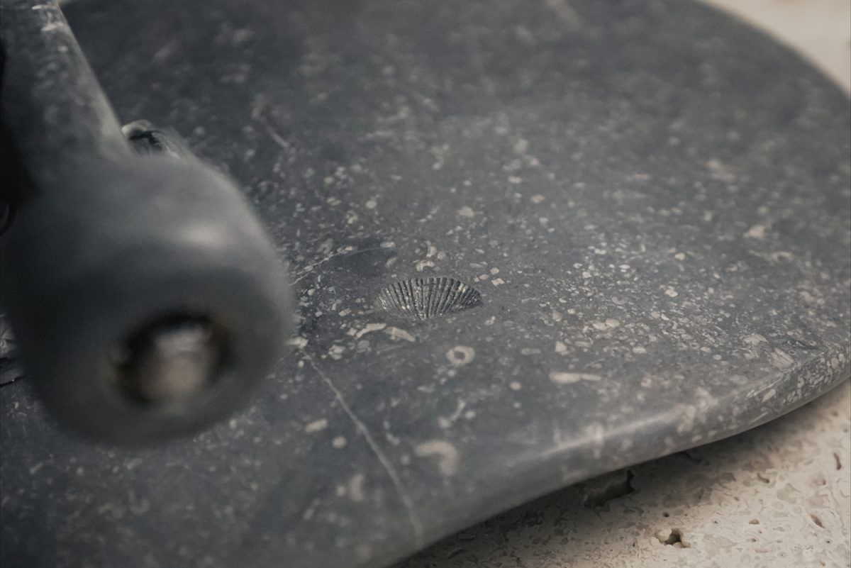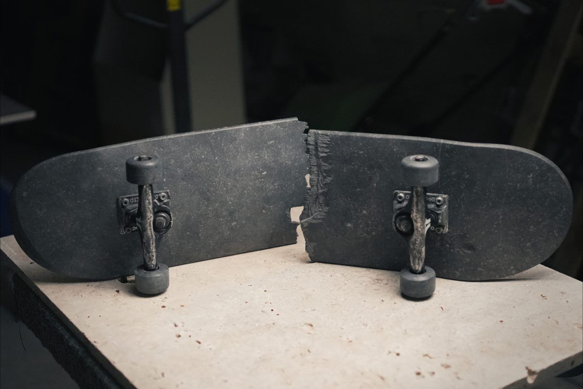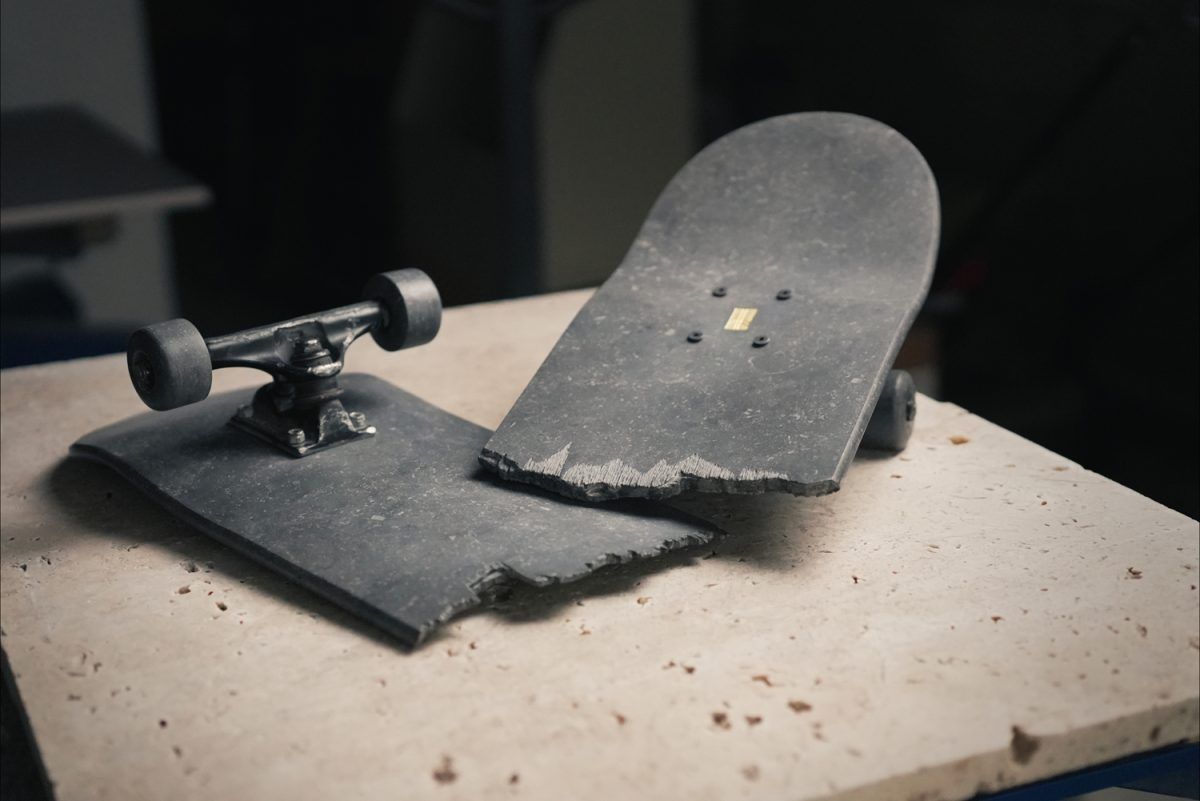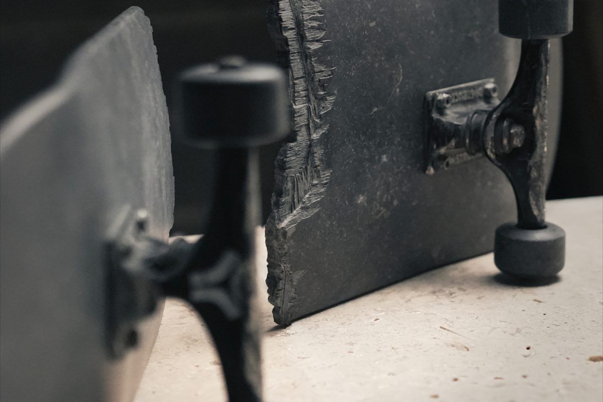 L’artiste français Josselin Kayser pousse les frontières du réalisme à son paroxysme avec cette sculpture. Réalisée presque intégralement en marbre et façonnée à la main, la pièce reprend les codes formels d’un skateboard classique. Même la cassure est des plus fidèles. La planche et les roues ont été façonnées ; seuls les trucks échappent au geste sculptural et s’intègrent parfaitement à l’ensemble.